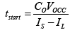 在啟動開始時,輸出電容器的平均充電電流為正值,充電電流等于(IS-IL),如等式1所示。在VO上升至VOCC之前,輔助匝電壓低于VDD,此時CDD無法通過輔助匝充電。但在此期間,CDD會被Irun和柵極驅動電流放電。如果 VDD低于VDD(off),UCC28700器件就會關斷。為確保器件順利啟動,在ta內VDD必須大于VDD(off)。在等式8和等式9中,應用了一個臨界條件。Tstart是VO從0上升至VOCC的時間。等式2是VOCC和VDD(off)的關系。在等式8 中,有1mA的估計柵極驅動電流,而且為VDD添加了1V的裕度。VCST是芯片選擇閾值電壓。在啟動開始時,UCC28700 VS引腳上的電壓為低,因此VCST保持其最大值。