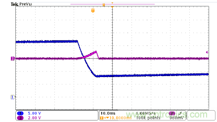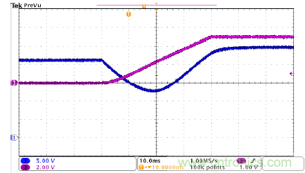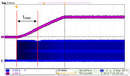 圖4是UCC28700的啟動波形,CH1是MOSFET柵極驅動信號,CH3是輸出電壓。該器件啟動順暢,沒有過沖和聲頻噪聲。該圖顯示,UCC28700器件有非常好的啟動性能。在圖4中,tstart接近18ms,與計算結果吻合。