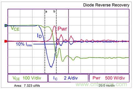 必須獲取在開關周期的部分時段(此時電流為無功模式使二極管導電)時的二極管導通損耗資料。通常量測峰值、負及反向導電電流10%點的資料。