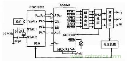 以SA4828與單片機C8051F020為核心構成的控制器電路設計如圖4所示。控制電路根據給定的參數輸出三相SPWM信號給智能功率模塊IP-M,實現對功率晶體管的通斷控制。C8051F020通過8位P0端口與SA4828的地址、數據管腳AD0~AD7相連,工作時,單片機首先對SA4828進行初始化,定義載波頻率,電源頻率范圍、死區、最小脈沖取消時間等參數。然后向SA4828的控制寄存器傳送電源的頻率控制字和幅度控制字等參數。正常工作時,根據需要對SA4828的控制數據進行修改,實現系統的反饋與實時控制,以及調壓控制。為實現系統的穩壓功能,采用平均值反饋PI調節。輸出電壓經隔離送入C8051F020單片機的A/D轉換口即P3.0口,轉換結果參與PI運算,運算結果即為SA4828幅度控制寄存器的控制字。從RPHT~BPHB的6個引腳輸出相應頻率和電壓的SPWM控制信號,經隔離電路后,分別控制智能功率模塊IPM的6個IGBT的導通與截止,最后在3個輸出端上產生對稱的三相SPWM電壓。SA4828作為單片機的外設,與單片機并聯,通過對單片機編程,只需將SPWM的初始化信息和控制信息寫入SA4828的相關寄存器,即產生精確的全數字化的三相的SPWM波形。