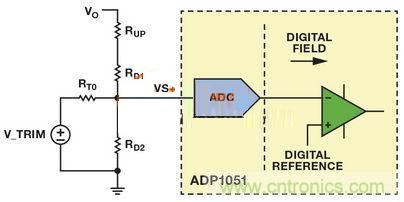 VS+引腳上的正常工作電壓為1V。若 VTRIM為1V左右且RT0遠大于RD2,則可忽略電路的其余分支部分。復合網絡用作簡單分壓器,并調節RUP電阻值,提供類似于模擬控制器的特性,實現了模擬電源模塊中的電壓向上調整。