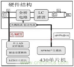 考慮到系統效率,不需要進行boost升壓,可以直接逆變。故本系統結構圖如圖1所示。SPWM信號控制硬件全橋電路,然后經過LC濾波電路可以得到正弦波。以MSP430單片機為核心的數字控制系統需要采樣電流量、控制硬件電路系統以及形成良好的人際交互界面。