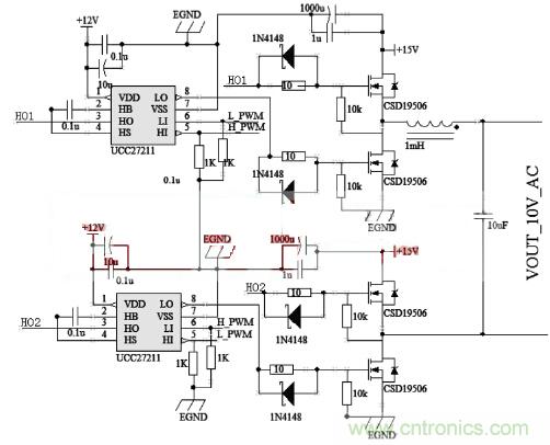 可以濾除載波頻率。考慮到MOS管需要相對較小的導通電阻RDS(on)和較小上升時間和下降時間的,本系統選用CSD19506。本系統需要驅動全橋,為了提高MOSFET的導通速度,降低開關損耗,因而選用TI提供的高速半橋驅動芯片UCC27211。圖2是全橋部分電路圖。