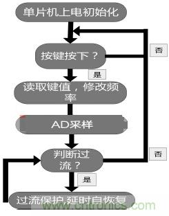 軟件結構框圖如圖1,主程序框圖如圖3。程序執行的流程如下所述:單片機上電之后,系統進行按鍵、片上ADC12和LCD顯示屏初始化,程序查詢按鍵,若有相應按鍵按下,修改正弦波頻率,然后AD采樣電流判斷是否過流;否則返回繼續查詢按鍵。如果輸出過流,程序將關閉SPWM輸出,延時自恢復;否則返回按鍵查詢。