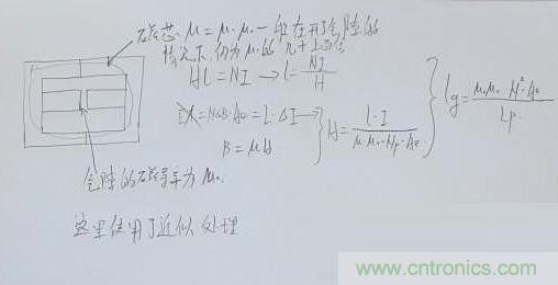 上面做了近似,近似所有的磁場能量都儲存在氣隙里面,因為磁芯的磁導率很高,氣隙的磁場強度是磁芯的幾時到幾百倍,所以,近似磁芯為磁路短路,磁回路長度近似為氣隙長度。