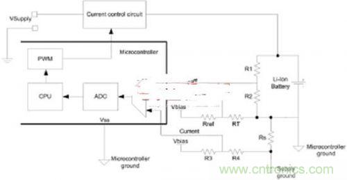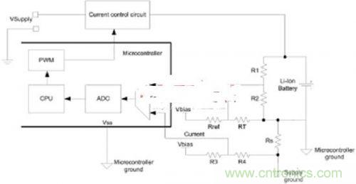 電池負端可作為微控制器接地,這就讓電壓、溫度和電流反饋可參考微控制器接地,并能進行單端ADC測量。對于電流反饋而言,正偏移電壓需要引入,而反饋電壓在電池充電時將為負。如圖5所示,電阻R3和R4提供了所需的偏移電壓。