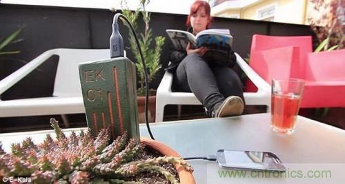 智利工程師最新研制的生物充電器——“E-Kaia”可以將植物變成一個個小小的“充電站”,只需將它插入植物土壤之中,花盆的USB輸電端便能對手機等設備充電。