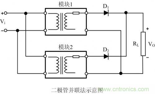 圖 4是電源輸出二極管并聯(lián)法,在兩組模塊輸出端先分別串接二極管D1、D2,然后再并聯(lián)。此種方案與電源輸出電阻并聯(lián)法原理相同,優(yōu)點(diǎn)在于可以利用二極管防止不同電源模塊的輸出電流逆流到另外一個(gè)模塊,形成內(nèi)環(huán)流。