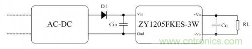 AC-DC電源模塊輸出電壓為12V,最大輸出電壓精度為±3%,那么輸出電壓范圍是11.64V~12.36V。而二極管D1使用1N4148,正向?qū)▔航禐?.7V,那么ZY1205FKES-3W模塊實(shí)際輸入電壓的范圍只有為10.94V~11.66V,這個電壓范圍還是在ZY1205FKES-3W模塊的輸入電壓范圍內(nèi),模塊可以正常工作,只是輸出電壓會較低。