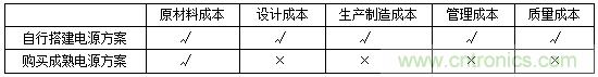 在電子系統開發中供電系統方案選擇許多設計工程師會選擇自行搭建電源方案,主要目的是為了節省成本,同時也是對自己電源技術水平的自信。大家以為電源系統的成本主要是采購成本,實際上,外購電源成品確實只需采購成本,但自行搭建電源方案的成本不僅包含原材料采購成本,還包含電源設計成本、生產制造成本、管理成本、質量維護成本等方面。