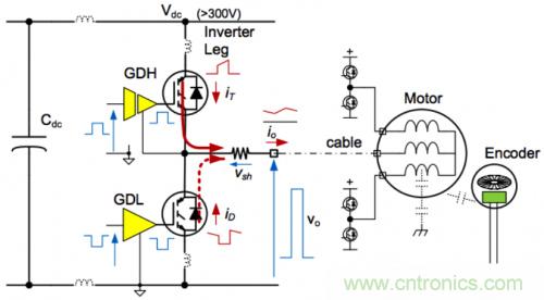 三相逆變器是一種功率電子開關(guān)電路,控制功率從直流供電軌到三個交流電機繞組的流動。逆變器有三條相同的腿,每條腿包括兩個IGBT晶體管和兩個二極管,如圖1所示。每個電機繞組均連接至通過分流器連接高端晶體管和低端晶體管的同一節(jié)點。逆變器使電機繞組在直流總線的高壓軌和低壓軌之間切換,以控制平均電壓。繞組具有極高的電感性,將阻擋電流的變化,因此,當(dāng)功率晶體管關(guān)閉時,電流將開始在連接至相反電源軌的二極管中流動。這樣,即使逆變器功率設(shè)備和直流鏈路電容中存在斷續(xù)傳導(dǎo),也會有電流連續(xù)流到電機繞組中。電機繞組阻抗充當(dāng)來自逆變器的高壓脈沖寬度調(diào)制方波輸出電壓的低通濾波器。將低壓控制電流連接至逆變器時存在巨大的困難。一個基本問題是,高端晶體管發(fā)射器節(jié)點在高壓總線高供電軌與低供電軌之間切換。首先,高端驅(qū)動器必須能夠驅(qū)動相對于一個發(fā)射器(可能比共用輸入信號高300 V或以上)的柵極信號。其次,通過分流器(vsh)的電機電流信號必須從300 V或以上的共模電壓中提取出來。其他問題將由電源電路中的寄生元件導(dǎo)致。當(dāng)功率晶體管或二極管的開關(guān)頻率超過1 A/ns時,即使是10 nH的PCB走線電感也可能導(dǎo)致顯著的電壓(>10 V)。寄生電感和部件電感會導(dǎo)致振鈴,結(jié)果使設(shè)備開關(guān)產(chǎn)生的噪聲脈沖的持續(xù)時間變長。甚至電機電纜的高頻阻抗也可能帶來問題,因為出于安全考慮,配電板可能離電機很遠。其他效應(yīng)包括噪聲從電機耦合到反饋傳感器信號中,其原因是快速切換的繞組電壓波形。問題將變得更加嚴重,因為驅(qū)動電路的功率額定值將增加電路板的物理尺寸,結(jié)果將進一步增加寄生電感,甚至提高電流和電壓開關(guān)速率。