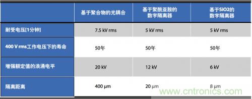 安全標(biāo)準(zhǔn)通常規(guī)定1分鐘耐壓額定值(典型值2.5 kV rms至5 kV rms)和工作電壓(典型值125 V rms至400 V rms)。某些標(biāo)準(zhǔn)也會規(guī)定更短的持續(xù)時間、電壓浪涌(如10 kV峰值并持續(xù)50 µs)作為增強絕緣認證的一部分要求。聚合物/聚酰亞胺隔離器可提供最好的隔離特性(見表1)。聚酰亞胺數(shù)字隔離器與光耦合器類似,在典型工作電壓下,工作壽命超過電機,額定使用壽命為50年。SiO2隔離器的工作壽命與之接近,但是,對高能浪涌的保護能力卻較弱。