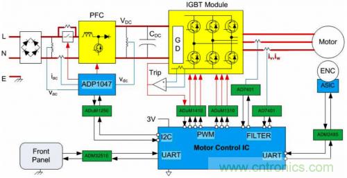 展示了柵極驅(qū)動、通信和反饋信號隔離的典型驅(qū)動電路如圖4所示。在該系統(tǒng)中,隔離的Σ-Δ ADC用來測量電機繞組電流,數(shù)字位流則由電機控制IC上的數(shù)字過濾電路進行處理。位置編碼器包含一個ASIC,由其通過一個隔離式RS-485接口將位置和速度數(shù)據(jù)發(fā)送給電機控制IC。其他隔離式串行接口包括連接PFC的I2C接口以及連接前面板的隔離式RS-232鏈路。在此例中,PWM信號與逆變器模塊隔離,IGBT由一個嵌入該模塊中的電平轉(zhuǎn)換柵極驅(qū)動器驅(qū)動。