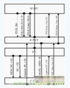 協助TLB進行虛實地址轉換是CP0的主要功能之一。TLB屬于系統的特權資源,只有CP0有權對其進行訪問,因此CP0與TLB之間的連線較多,數據交換的時延也比較關鍵。同時,PC模塊與CP0的數據交換也非常重要。因此,CP0單元在版圖上最好同時靠近TLB和PC模塊。本設計將CP0中與TLB相關的邏輯與寄存器獨立為CP0T,放在MMU與PC模塊之間;CP0的其余部分歸為CP0E,放在PC下部,也就是整塊芯片的最下端。如下圖所示。