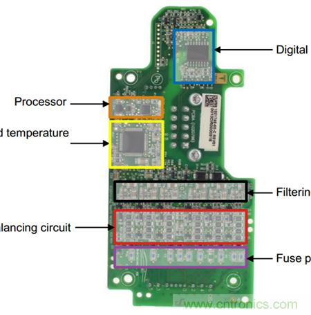 因?yàn)閮煞N均衡功能各有利弊,本來主動(dòng)均衡功能是可以替代被動(dòng)均衡功能的,但因?yàn)榻Y(jié)構(gòu)復(fù)雜成本高,而且結(jié)構(gòu)復(fù)雜之后故障率也會高而與被動(dòng)均衡處于膠著狀態(tài),業(yè)內(nèi)人士常為了哪種均衡更好爭論不休。特斯拉的BMS均衡功能(被動(dòng)均衡,見下圖中Cellbalancingcircuit中所指均為放電電阻)經(jīng)常被示范以證明被動(dòng)均衡強(qiáng)于主動(dòng)均衡。其實(shí)這反而證明了任何技術(shù)選擇都要和整體條件適用的道理。