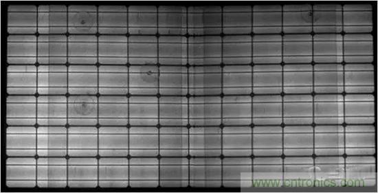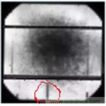 給晶硅組件施加電壓后,所激發(fā)出的電子和空穴復(fù)合的數(shù)量越多,其發(fā)射出的光子也就越多,所測得的EL圖像也就越亮;如果有的區(qū)域EL圖像比較暗,說明該處產(chǎn)生的電子和空穴數(shù)量較少(例如圖3中電池中部),代表該處存在缺陷(復(fù)合中心);如果有的區(qū)域完全是暗的,代表該處沒有發(fā)生電子和空穴的復(fù)合(圖3和圖4中紅線所標(biāo)處),也或者是所發(fā)光被其它障礙所遮擋(圖3和圖4主柵線處),無法檢測到信號。