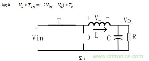 當(dāng)PWM驅(qū)動高電平使得NMOS管T導(dǎo)通的時候,忽略MOS管的導(dǎo)通壓降,等效如圖2,電感電流呈線性上升,MOS導(dǎo)通時電感正向伏秒為: