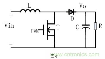 Boost升壓型電路拓?fù)洌袝r又稱為step-up電路,其典型的電路結(jié)構(gòu)如下圖4所示: