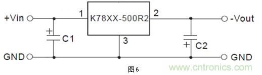 從上面Buck電路以及Buck-Boost電路結(jié)構(gòu)原理來看,主要的區(qū)別是兩者二極管與功率電感的位置互換。因此,若將Buck電路的輸出Vo引腳接成輸入的GND,而之前的輸入GND就變成了負(fù)電壓輸出了,即變成了Buck-Boost的電路結(jié)構(gòu)。對應(yīng)到金升陽K78xx-500R2系列的產(chǎn)品就變成了如下圖6所示的負(fù)輸出。