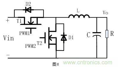 當(dāng)T2管截止時,T1管與D1、L等器件構(gòu)成了Buck型降壓電路,可以實(shí)現(xiàn)對后級的負(fù)載進(jìn)行供電;反之,當(dāng)T1管截止,T2管與D2二極管、L等器件構(gòu)成了Boost升壓電路,對前端電源進(jìn)行能量補(bǔ)充。目前對T1和T2管的控制以模擬方式控制相對還是比較困難,均是以數(shù)字控制方式為主。