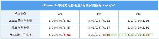 筆者使用了5款不同品牌原配的充電器+2款帶USB輸出的插板進(jìn)行測(cè)試(手機(jī)50%電量),發(fā)現(xiàn)輸出電壓基本略微大于5v(某些線補(bǔ)較高的能去到5.3v,而沒有線補(bǔ)的低于5v),而電流也在1a左右。所以使用某些非原裝充電頭對(duì)iPhone進(jìn)行充電,確實(shí)會(huì)比原裝充電頭更快。當(dāng)然,山寨/品質(zhì)低劣的充電器就另說了。