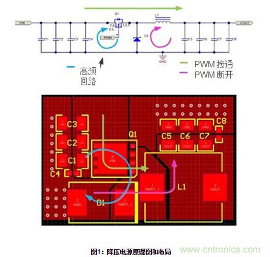 除了這些基本的布局規則,我通常首先會識別開關回路,然后確定哪些回路具有高頻開關電流。圖1所示為針對降壓電源(原理圖和布局)的簡化功率級的一個示例。