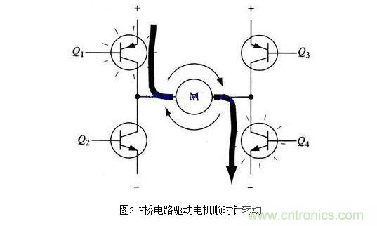 要使電機運轉,必須使對角線上的一對三極管導通。例如,如圖2所示,當Q1管和Q4管導通時,電流就從電源正極經Q1從左至右穿過電機,然后再經Q4回到電源負極。按圖中電流箭頭所示,該流向的電流將驅動電機順時針轉動。當三極管Q1和Q4導通時,電流將從左至右流過電機,從而驅動電機按特定方向轉動(電機周圍的箭頭指示為順時針方向)。