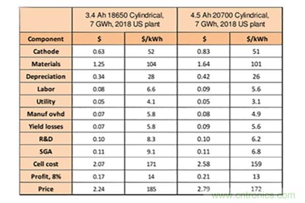 Tesla公開說明選擇20700的優勢:“If the new meets the same life and safety requirements, once it is produced at the same yields and at high volume, it will offer about 3-4 % increase in energy density and a 7 % reduction in cost”,即在達到與18650同樣的良率和產能后,能帶來能量密度增加和成本下降兩個優勢,這從下表中也能得到充分體現。