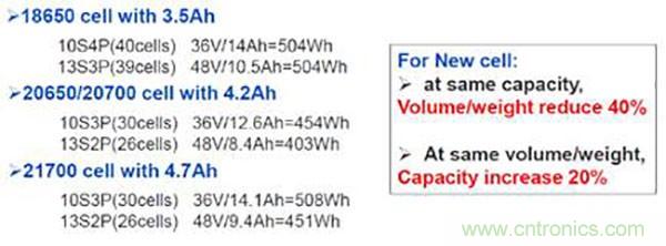 采用20700 /21700 /20650后,由于同等能量下,電池數量減少(以21700為例,減少1 /3),這會帶來整個Pack內部金屬連接件數量的減少,這會進一步降低電池Pack的質量。