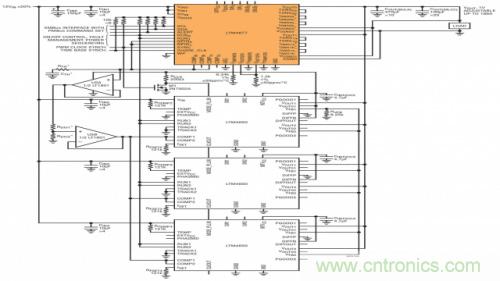 µModule DC/DC 穩(wěn)壓器可提供一種同時(shí)提供高功率輸出和 DPSM 功能的簡單和有效之方法。由于可容易地通過并聯(lián)多個(gè) µModule 穩(wěn)壓器以提供高電流輸出 (各個(gè)通道彼此之間的電流匹配準(zhǔn)確度標(biāo)稱值在 1% 以內(nèi)),從而降低了產(chǎn)生熱點(diǎn)的可能性。而且,只有其中一個(gè) µModule 穩(wěn)壓器必需具備 DPSM 能力,原因是即使并聯(lián)的 µModule 未內(nèi)置固有的 DPSM,它也能提供完整的數(shù)字接口。圖 2 示出了一個(gè) LTM4677 (36A DPSM µModule) 與 3 個(gè) LTM4650 (50A µModule) 相并聯(lián)的應(yīng)用電路原理圖。
