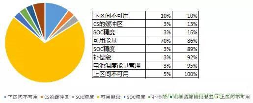 首先,我們考慮一下能量分配,在SOC從整個100%到零或者說整個電池能量管理過程可以分解為:上下兩段留存的不可用能量(純電動汽車上下留余更多一些)、可用能量、SOC誤差、調節電池溫度所需要的能量、容量下降的補償、插電式混合動力汽車的CS緩沖區(純電動沒有這段)。