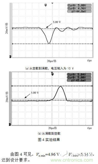 采用電阻器作為負(fù)載,并用開關(guān)分別接入和斷開進(jìn)行了從空載到滿載和從滿載到空載的實(shí)驗(yàn),輸出電壓的波形如圖4所示。