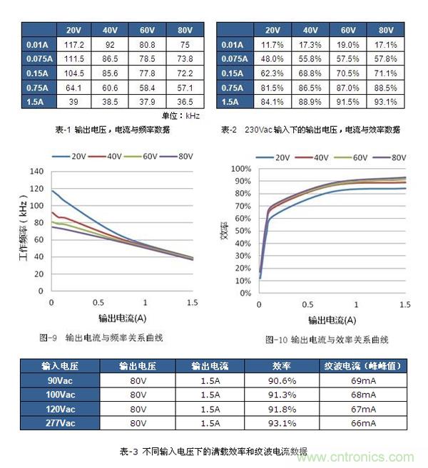 在230Vac的輸入條件,80V、1.5A的條件下得到最高的效率93.1%。詳細數據如表-2和圖-10所示。表-3是全電壓范圍下的滿載效率和紋波電流數據。可以看出紋波電流的表現也很優秀,峰-峰值小于2.5%,都在70mA以下。