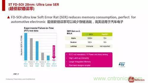 除了低功耗與低成本,FD-SOI工藝在可靠性上也表現出色。沈磊指出,從意法半導體給出的數據來看,由于FD-SOI工藝的敏感體積更小,對閂鎖效應(latch-up)免疫,具備更低的SRAM軟錯誤率,以及更好的電磁兼容性,使其更適用于高可靠應用領域,例如汽車、銀行與生命維持系統等。
