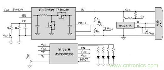 管理移動電源子系統的活動對保持電池的能級至關重要,避免將其浪費在內部功能上。該參考設計中包含一個MSP430?微控制器(MCU),其作為內務處理型MCU,用來優化移動電源的功耗。當MCU檢測負荷較低時,它會關閉大部分子系統;待機狀態下,移動電源僅消耗22mA電量。為防止電池出現高放電電流,MCU會調整限流。當負荷電流發生變化時,MCU還會對輸出電壓做出小幅調整,從而提供一個穩壓良好的輸出。最后,MCU通過其集成的模數轉換器(ADC)測量電池電壓和溫度。然后,MCU驅動LED來顯示電池電壓并監視溫度,以保持移動電源處于安全工作范圍。