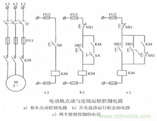 在圖a中,按下按鈕SB,電動機啟動,松開后電動機停止。是典型的點動控制。