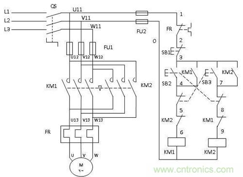 這張圖如果沒有編號6和編號9那兩個接觸器常閉觸點,和編號5和編號8那兩個機械互鎖按鈕的常閉觸點,就很好理解。即按下SB2,電動機正轉,按下SB3,電動機反轉。