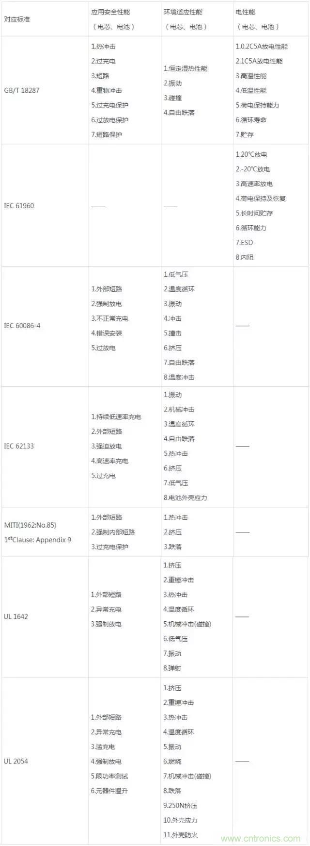 【導讀】今天編輯將這些主要鋰電池標準分別從不同的角度考察了鋰電池的安全性和電性能,現將分類如下。從表上可以看出,目前鋰電池各種標準主要從三個角度考察鋰電池的安全及電性能。