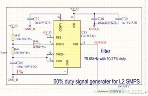 前級電源屬于典型定壓設計,無需給出設計原理,本文重點介紹后級半橋電路。具體原理圖見圖2和圖3。圖2為采用汽車級定時器電路設計的50%占空比信號發生器,用于給半橋開關電源提供控制信號,其中R49可以用來調整開關頻率,一般可以設定在70kHz到300kHz之間,頻率選擇主要根據電路板實際空間尺寸和變壓器的伏秒積進行折衷選取。