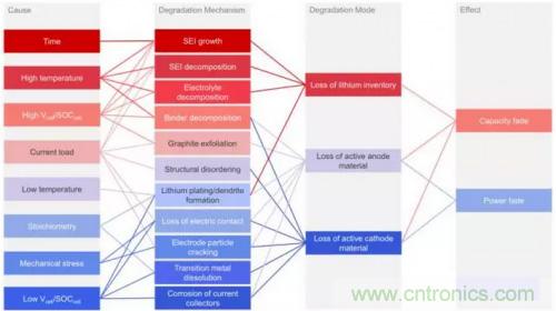 下面我們就來了解以下,為什么鋰離子電池在使用的過程中,會發生衰降呢?首先我們必須清楚,在鋰離子電池的內部,除了正常的鋰離子嵌入和脫嵌正負極的反應,還會存在很多副反應,例如SEI膜的生成和生長,電解液分解,粘結劑分解,正負極活性物質破裂等等因素,都會造成鋰離子電池的容量下降。雖然造成鋰離子電池衰降的因素很多,但是歸結起來可以分為三個大類:1)鋰損失,由于鋰離子電池是一個封閉系統,內部的物質是恒定的,SEI膜的生成、破壞,負極析鋰等都會消耗僅有的Li資源;2)正極活性物質損失,在鋰離子電池使用的過程中往往會發生正極材料顆粒破碎,粘結劑分解和正極材料晶體結構改變等因素,這些都會導致一部分正極活性物質失去嵌鋰等能力;3)負極活性物質損失,例如負極活性物質脫落,粘結劑分解等因素,都會導致部分負極活性物質顆粒失去與導電網絡的導電連接,從而使其無法嵌鋰,造成鋰離子電池容量損失。