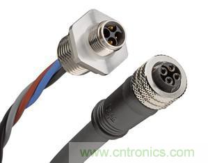 四針的 M12 連接器可以容納高達 14 AWG/2.5 mm2規(guī)格的尺寸,額定操作范圍為 300 V交流/直流,絕緣強度電壓達 1,600V。連接器的工作溫度范圍為攝氏 -20度至 +90度,并擁有IP67 等級的密封介面,使其理想用于惡劣以及潮濕的工業(yè)環(huán)境。連接器具有防塵功能,并且可以在短時間內(nèi)浸沒于不超過 1 公尺(3 英尺 3.37 英寸) 水深中。除了面板安裝的公端/母端插座電線組外,F(xiàn) 編碼系列中還包含單端和雙端電線組,采用直管或 90度公端或母端連接器。