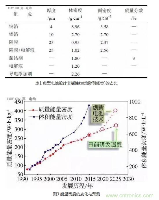 電池的能量密度基本由電池的正負極決定的,但光是正負極活性材料也不能保證電池能發(fā)上電,得有很多非活性物質(zhì),比如導電輔助劑、活性粉末之間的粘結(jié)劑、隔離膜、陰陽極的箔材、絕緣固定的膠紙、外邊鋁塑膜殼子或者鋼鋁殼等等(表1 典型電池設計非活性物質(zhì)的占比)。我們的媒體,總喜歡搞大新聞,有意無意的忽略這部分物質(zhì)的含量,得出的能量密度老能高到天上去,與事實相差較大,誤導無辜吃瓜群眾。其實,這部分相當重要,就拿過去十幾年的技術(shù)進步來說,我們電池的能量密度提升主要就是靠著活性物質(zhì)占比的提升來實現(xiàn)的。
