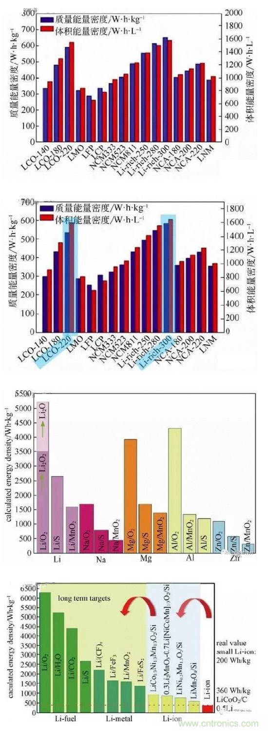 中科院的吳嬌楊博士對于選取了現(xiàn)有理論容量較高、理論容量較低但是商業(yè)化比較成熟等綜合性能比較好的正負極材料,進行正負極搭配,大致得出了結(jié)果:Li-rich-300 對Si-C-2000 的電芯體系,在所有的電池體系中具有最高質(zhì)量能能量密度584 W·h/kg以及最高體積能量密度1645 W·h/L。該數(shù)值不包括封裝材料與極耳。