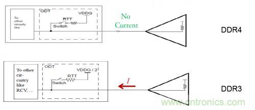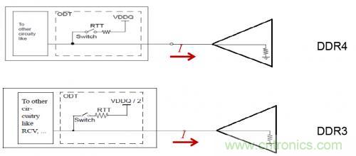 為了直觀的看出端接方式的差異對總的功耗的影響,下面分別比較了在輸出高和低得情況下,DDR4/DDR3的電流流向。