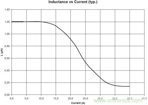 電感中直流電流的增加時,電感透磁率的數(shù)值會逐漸減少,因此電感值會緩慢下降。電感廠商會根據電感的電感值的下降程度為指標的額定電流,"基于電感值的變化率的額定電流",即Saturation Current,大部分電感廠商將電感值下降20%時的通過電感直流電流作為額定電流。下圖是Wurth公司某款電感的電感值vs電流的曲線圖。該款電感規(guī)格書上將saturation current設定為電感值下降10%時的電流值,為16.6A。如果將saturation current設定為電感值下降20%時的電流值的話,大約為18.2A。
