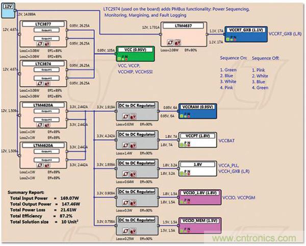 圖 3:用于 Arria 10 GX FPGA 電路板 (圖 1) 的電源樹。用 LTpowerPlanner 設計,該軟件是一款分析性和簡便易用的初步設計工具以用來映射電源要求。