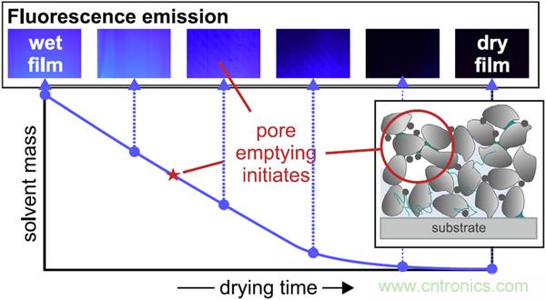 德國(guó)卡爾斯魯厄理工學(xué)院薄膜技術(shù)研究所的Stefan Jaiser等人引入了一種實(shí)驗(yàn)裝置,在涂層干燥溶劑蒸發(fā)過程中能夠測(cè)量涂層的收縮,涂層表面液體含量,以及表面孔洞消失的過程。在電極漿料中少量加入一種熒光增白劑,涂層中的液體在UV-A紫外線輻照下能夠發(fā)出藍(lán)光,因而可以用相機(jī)觀察到液相。圖像處理可以估算涂層表面的液體含量,跟蹤電極孔隙中的液相消失過程。同時(shí),濕涂層的厚度采用二維激光位移傳感器測(cè)量。實(shí)驗(yàn)結(jié)果揭示了液相去除,電極孔隙中開始形成的時(shí)刻。