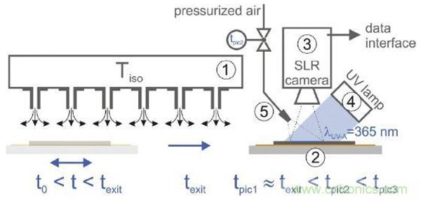 ①-對(duì)流槽噴嘴干燥機(jī),②-溫控板,③-SLR相機(jī),④-UV燈,⑤-加壓空氣噴嘴