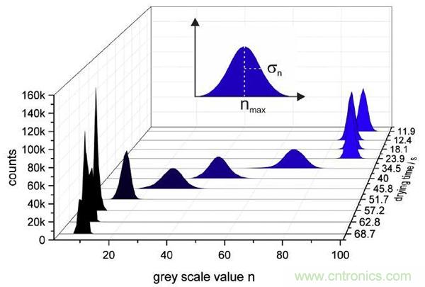 圖2為圖像處理流程,每個(gè)圖像都是RGB灰度值疊加照片,首先將照片分割成紅(red)、綠(grenn)、藍(lán)(blue)三原色各自的顏色通道。本文中只分析紅色通道,因?yàn)樗{(lán)色在長(zhǎng)時(shí)間干燥后仍舊飽和狀態(tài),因而缺少最開始的信息,而綠色值強(qiáng)度低,接近零。采用MATLAB對(duì)圖像進(jìn)行處理,讀取每一個(gè)像素的灰度值并計(jì)數(shù),再做成灰度值高斯分布圖。標(biāo)準(zhǔn)偏差σ和平均灰度值nmax作為圖像處理的特征量,nmax表示涂層表面液體的含量。
