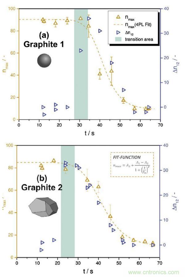 圖6.在烘干機(jī)中不同停留時(shí)間下第一張照片的nmax(三次實(shí)驗(yàn)平均值),以及第一、二張照片的差值Δn12(單次實(shí)驗(yàn))的對(duì)比:(a)Graphite 1 (球形, d50 = 8.9 μm) , (b) Graphite 2 (多面體, d50 = 20.4 μm)。nmax與四參數(shù)邏輯(4PL)擬合曲線近似,并表明了不同的初始平臺(tái)。從恒定nmax平臺(tái)到中間階段的過渡時(shí)域以綠色突出顯示。